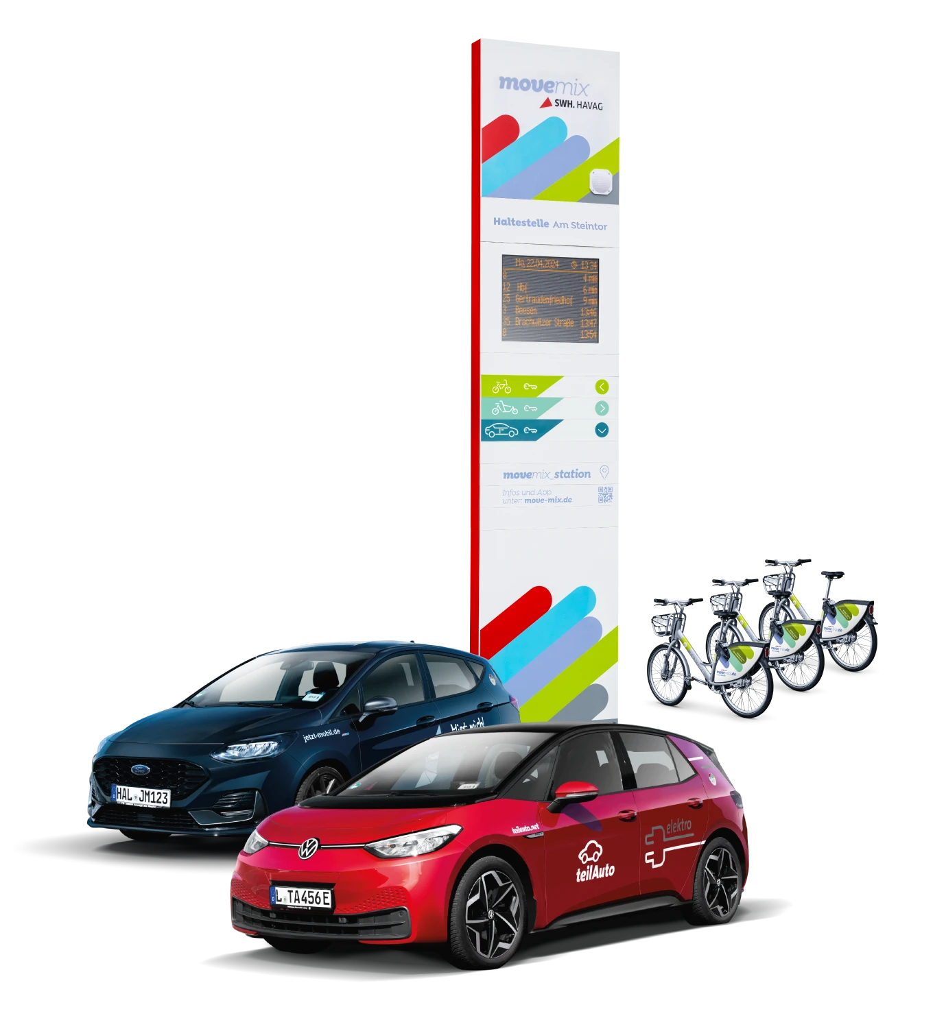 In Halle können movemix_bike ausgeliehen werden. So sind an über 100 Standorten über das gesamte Stadtgebiet ca. 450 Fahrräder, 50 E-Bikes sowie 6 Lastenräder verteilt.