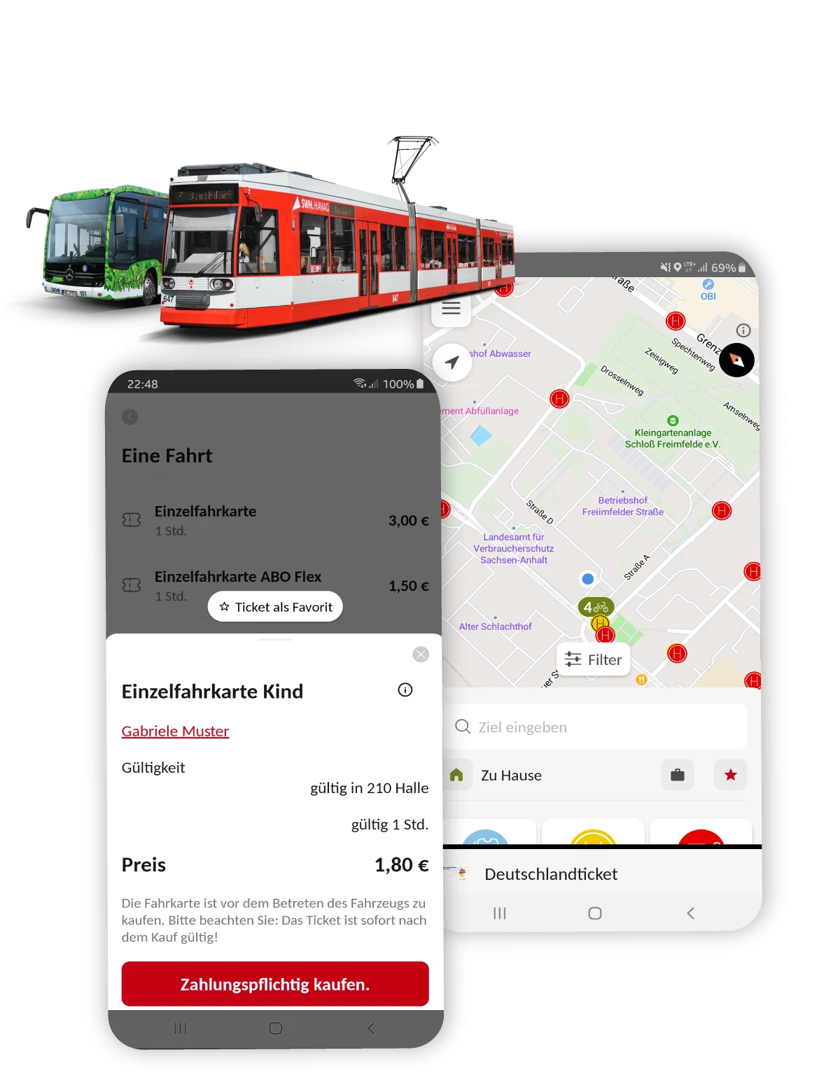 Kaufe mit der movemix_app dein ÖPNV Ticket als movemix_ticket, welches auch im MDV gültig ist. Du kannst zwischen Tickets für eine Fahrt, 24-Stunden-Karten und Zeitkarten wählen.