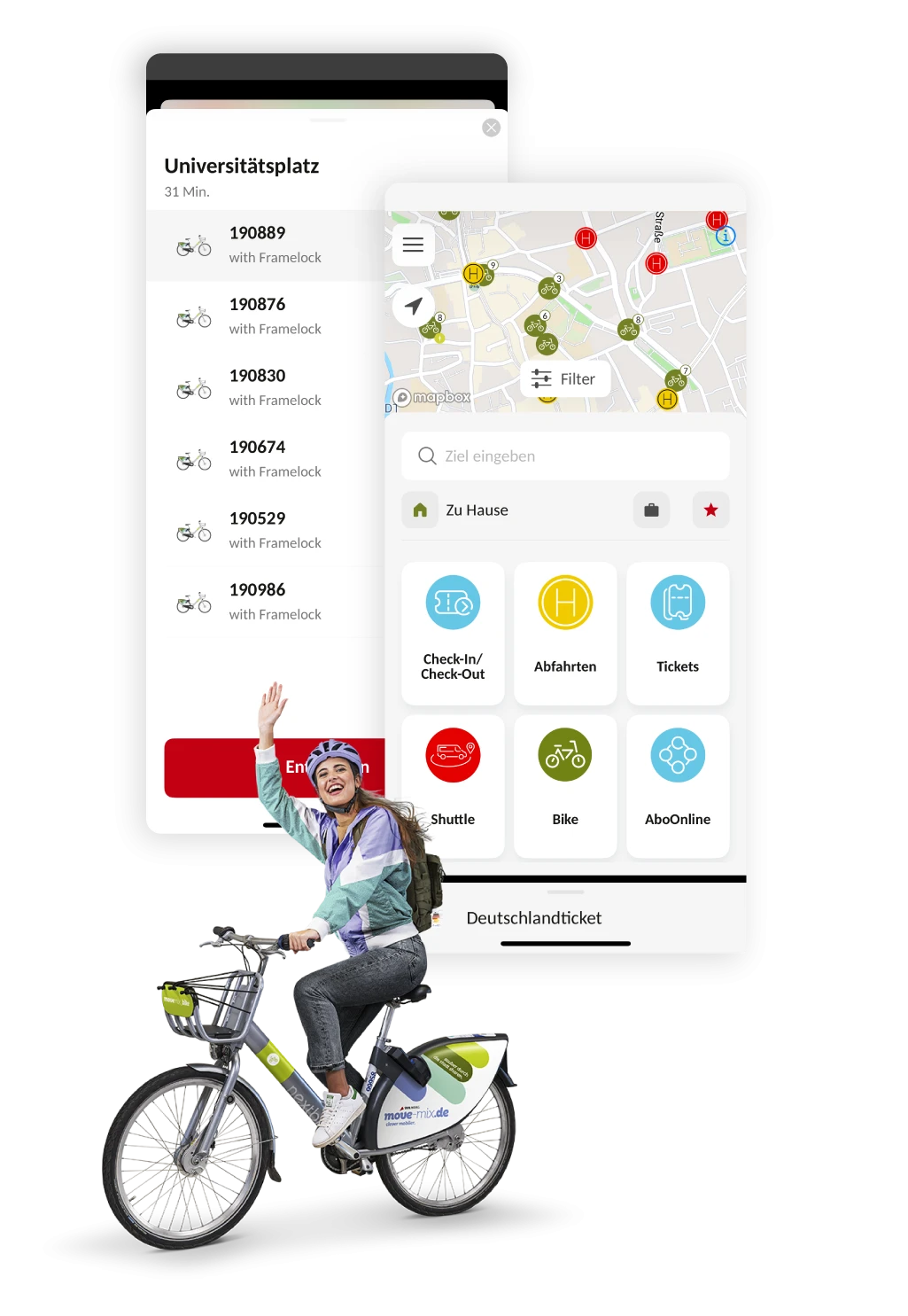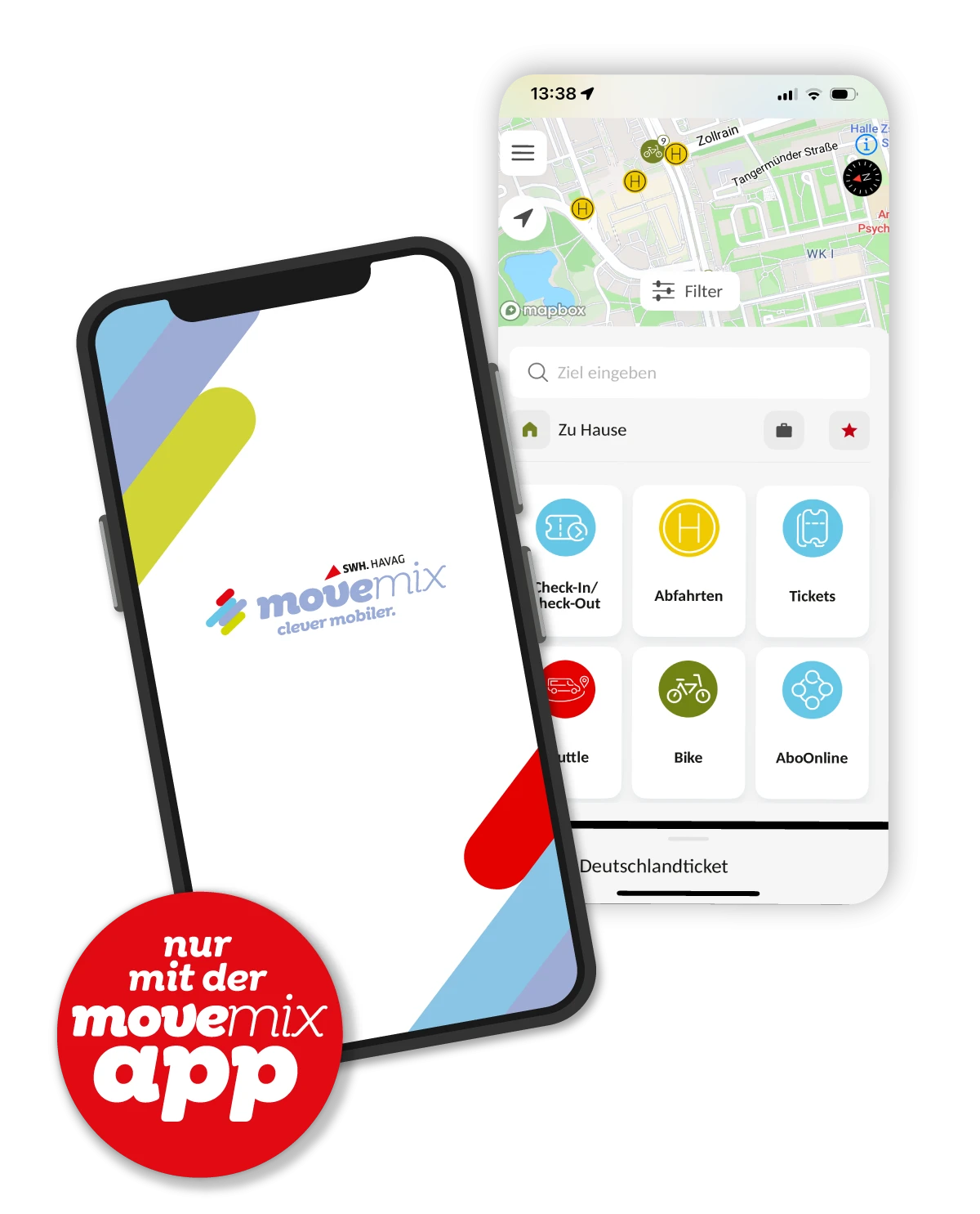 Das alles kann die movemix_app: Bike-Sharing und einen ökostrombetriebenen Shuttle-Service. Abo abschließen, dazu Verbindungsauskunft und Ticketkauf (auch mit Check-In/Check-Out Funktion) inklusive. Jetzt herunterladen und ausprobieren!
