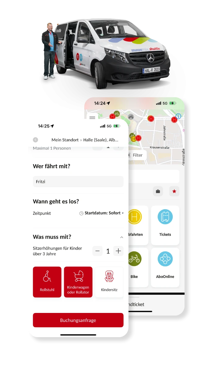 Zeitlich flexibel halten unsere movemix_shuttle an „virtuellen“ Haltepunkten ganz in deiner Nähe. So kommst du im Paulusviertel Plus und in Halle-Ost bequem weiter.