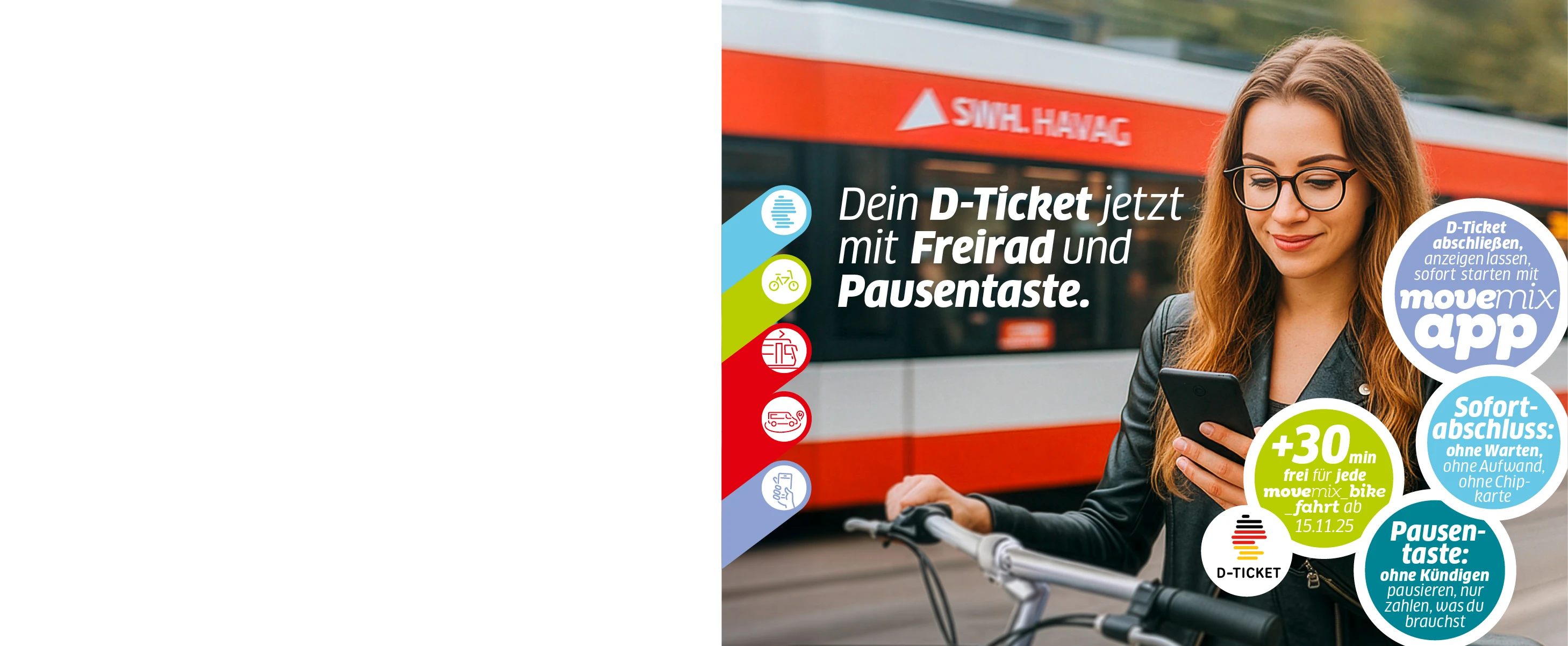 Das alles kann die movemix_app: Bike-Sharing und einen ökostrombetriebenen Shuttle-Service. Abo abschließen, dazu Verbindungsauskunft und Ticketkauf (auch mit Check-In/Check-Out Funktion) inklusive. Jetzt herunterladen und ausprobieren!